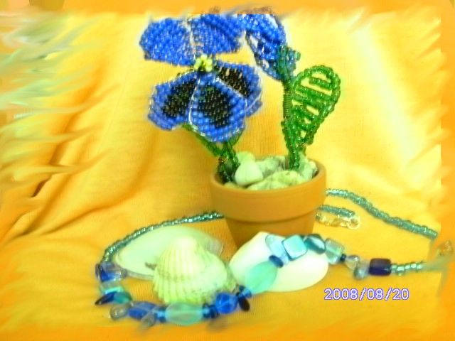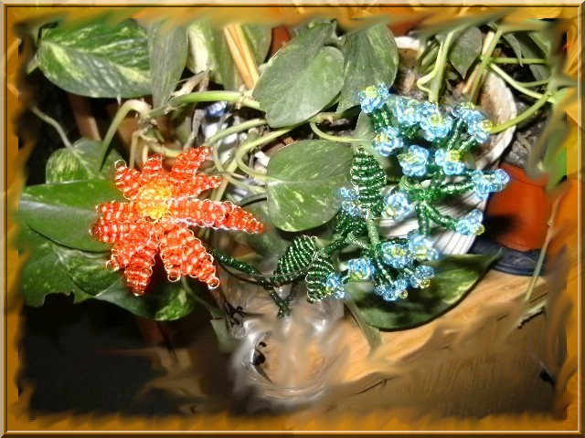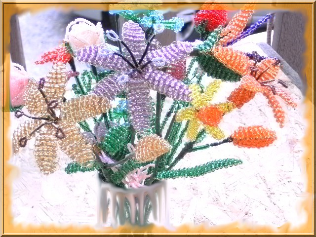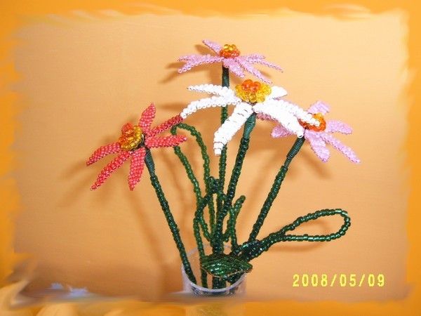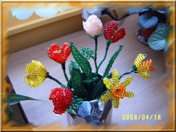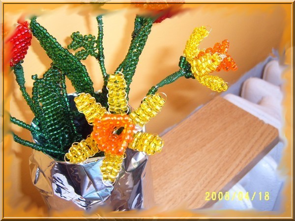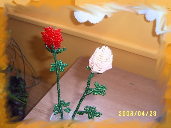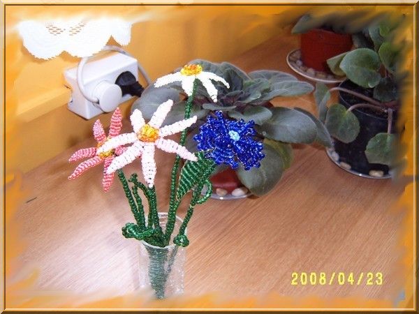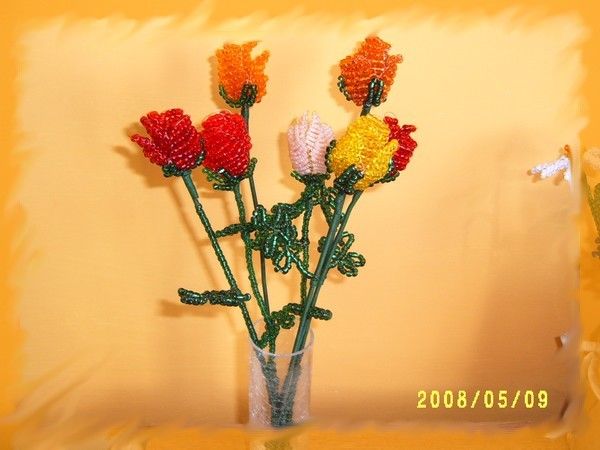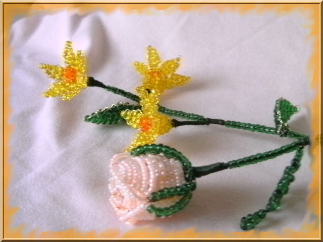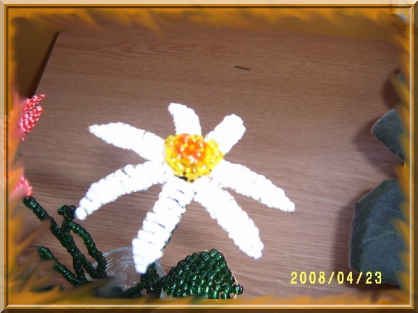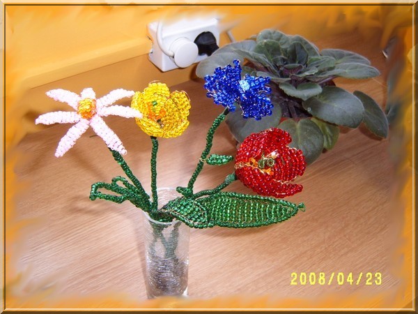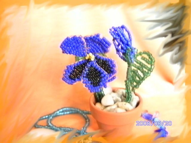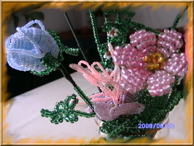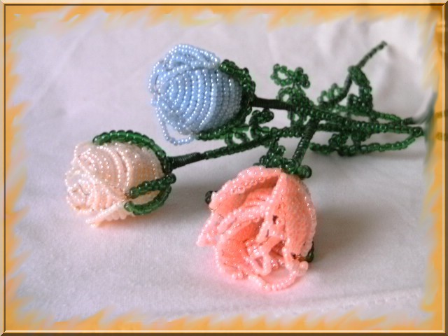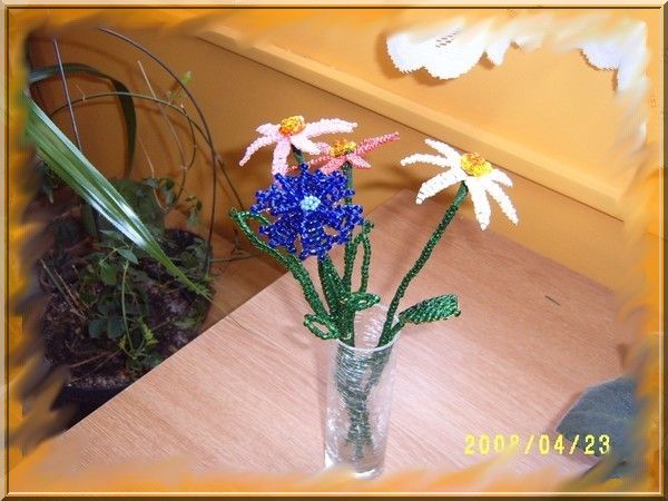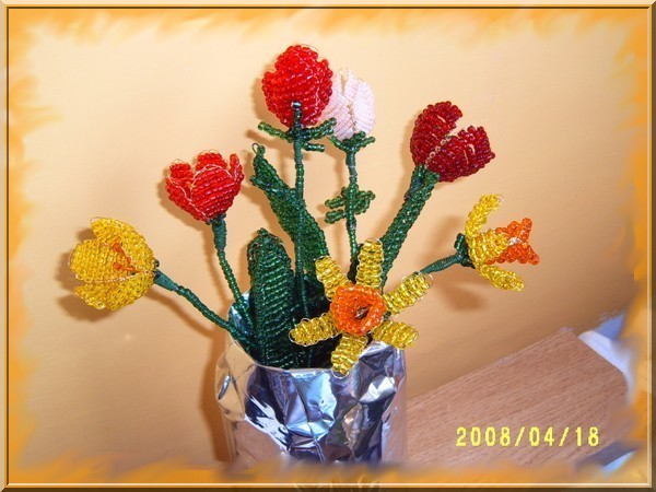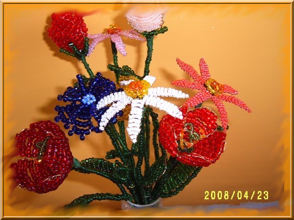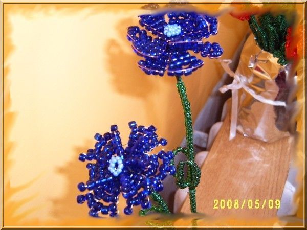 Munkáim! Mint a képeken is látható, a virágokat kása gyöngyből drótrafűzve készítem. A virágok képei többféle nézetből láthatók, a jobb megfigyelhetőség érdekében. Nagyításhoz kattints a képekre....